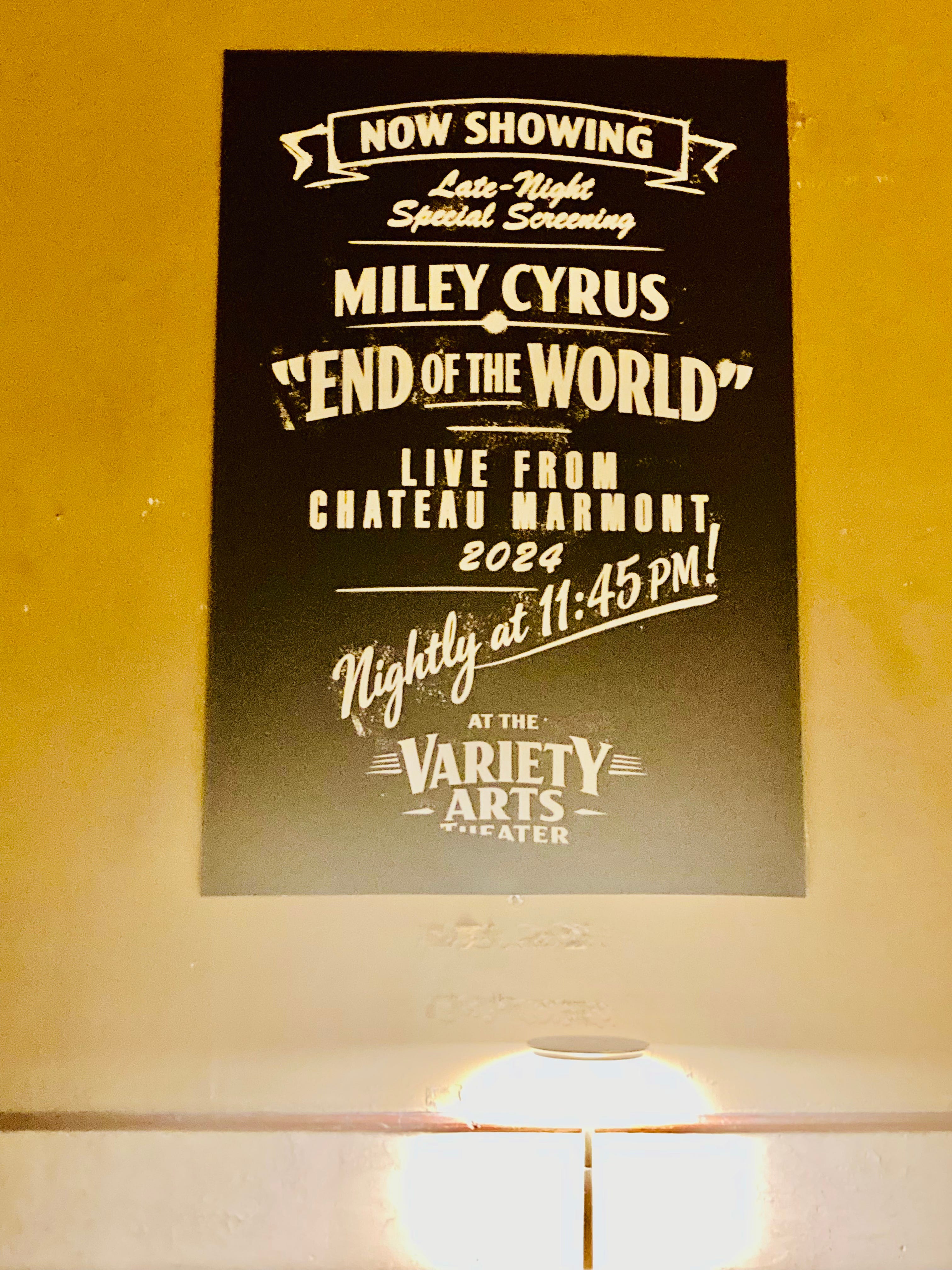 Some friends were in the audience and we wandered the ghost theater in a stupor together for an hour or so, before settling in a basement bar where the crowd smoked indoors while we sipped Evian and snacked on olives and bubble gum. Just around the corner, someone cosplayed a ravaged club heaux cosplaying a hooker. All around the building Louis Armstrong was singing in delight and dismay, threatening demolition of the hype beast spirit with his vibrato. We discussed grief, decanted some. Two guys who seemed giddy and disoriented, one carrying a full bottle of wine, walked up to us to compliment the reading and offer notes: that was a lot of audio though, before giving us all daps and stumbling off, the only review I need — exuberant, honest, proof that my desire to withhold in the service of close listening, my intention that evening, had succeeded just enough. They didn’t want to listen, but they didn’t leave. Disclosure kindly stopped for them. And moved on. When you’re invited to join a social experiment, don’t be too gentle. A sign for a Miley Cyrus show called “End of the World” adorned the wall just behind us, an Alec Baldwin doppelganger (mostly in the hair gel) I’d been noting aloud as such for a while looked over and smiled like he’d heard me and approved. A whimsical, chimeric smile. That phantom thread unraveling. And we dispersed like sweet embers, into the body of fire horse.