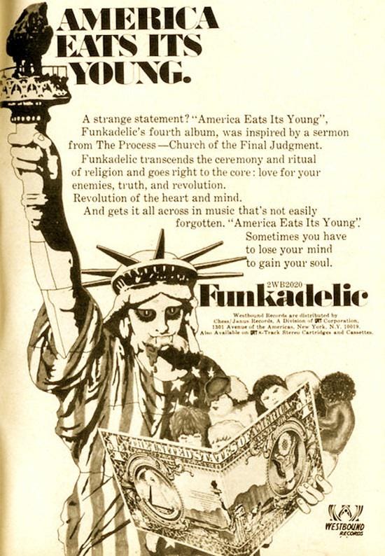 George Clinton made the one true song, “America Eats its Young,” sampled by J Dilla on his deathbed, and reenacted here. One day, when it’s no use, we’ll reject these carefully curated distractions from ourselves. In anticipation of that coming indifference, they get slicker, more intoxicating, more like mergers of house and field, radical pacifist gentry nonbinary elite fictions of the unassailable hope machine.